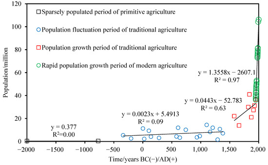 Based on population size and key drivers and with reference to the way in which China’s agricultural history is divided into development stages [3], the 4000-year population history of the LP can be divided into four stages (Figure 5). (1) The sparsely populated period of primitive agriculture (2000–476 BC): the limited area of arable land and grain yield per unit area in this period were due to the predominance of stone-made agricultural implements and the start-up phase of ridge cultivation techniques, combined with little warfare, and left the population at fewer than one million. (2) The population fluctuation period of traditional agriculture (475 BC–1530 AD): with the invention and development of agricultural techniques such as the straight shaft plough, curved shaft plough and ridge cultivation techniques, the history of Chinese agriculture entered a period of traditional agriculture during which an increase in cropland area and grain yield greatly stimulated the incentive to have a baby, but the population always fluctuated approximately 6.8 × 106 due to frequent wars and the expensive poll tax. (3) The population growth period of traditional agriculture (1531–1949 AD): this phase saw the development of traditional agriculture reach its peak. The increases in cropland area and grain yield did not contribute to an increase in the amount of grain-holding per capita, but the abolition of the poll tax, which had been in place for thousands of years, and the reduction in warfare during this period led to an increase in the population, reaching 4 × 107 in 1840 AD (4.43 × 106/year growth rate). (4) The rapid population growth period of modern agriculture (1950–2000 AD): with the development of modern agriculture since the founding of the People’s Republic of China in 1949 and the economic stimulation of the reform and opening-up policy in 1978, the population increased from 3.6 × 107 in 1949 to 1 × 108 in 2000 in less than 50 years (1.36 million/year growth rate).