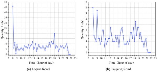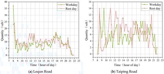 Changes in parking demand at different times. (a) The different parking demand on Lequn Road at different times; (b) The different parking demand on Taiping Road at different times.