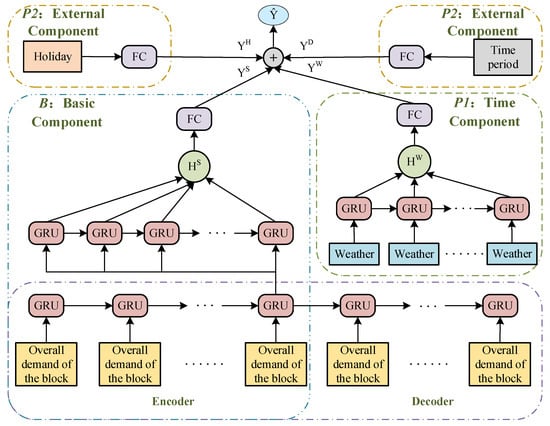 As described in the previous section, the features that have an impact on the demand are different, so their data formats are different. Therefore, in the procession of a model’s construction, two different types of components are used to model demand data and external feature data separately, as shown in Figure 5. The model mainly includes B: Base Components, which use the encoder–decoder structural framework to extract the features and patterns present in the historical parking demand data; P1: Temporal Components, which use gated recurrent units (GRU) to capture the temporal correlation based on the time-variant weather features which is related to the historical parking demand of the block; P2: External Components, where holiday features as well as time period features are modeled separately using fully connected neural networks.