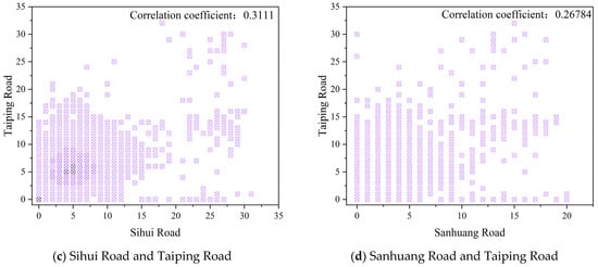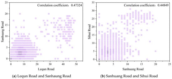 Taking the four on-street parking sections in Xiufeng District of Guilin—Sanhuang Road, Sihui Road, Lequn Road, and Taiping Road—as examples, the relative positions among several road sections can be observed through Figure 6a. In terms of physical location, the physical distance gradually increases between Taiping Road and Lequn Road, Sihui Road and Sanhuang Road, while by observing the two-dimensional scatter plot between the road sections, it can be seen that as the physical distance between the two road sections increases, the correlation between their parking demand decreases. It can also be observed that the correlation between two road sections that are very close in physical distance does not produce a very large gap with those that exist at a certain distance. It can be seen that the correlation between Lequn Road and Sanhuang Road, which are not physically located next to each other, even exceeds the correlation between Lequn Road and Taiping Road by quite a bit. Therefore, it can be inferred that there may be other types of features that also have an impact on the correlation between the road sections.