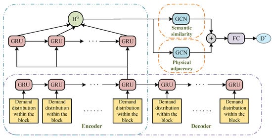 Based on the factors affecting the distribution of parking demand within a region in the previous section, and considering the time-invariant property that both factors are capturing internal correlations within the block, a demand distribution prediction model based on two types of graph structures is designed, as shown in Figure 8. The demand distribution embedding results extracted by the encoder–decoder are fed into a distribution prediction network combining gated recurrent unit network (GRU) and graph convolution (GCN), which is to capture the spatial correlation between road segments within the block. The two graph structures are represented by the physical proximity and semantic similarity among the road segments in the block, respectively, where nodes denote road segments in a block and edges denote connectivity relationships between road segments.