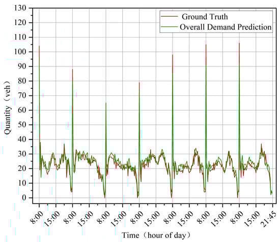 Finally, the target time interval inflows , , , and obtained from each component are combined to derive the quantity of overall parking demand prediction for the target time interval, which is defined as: