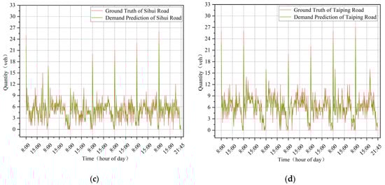Figure 13 shows the performance of our model on parking demand prediction under these ablation experiment settings. Due to the large amount of data and the density of the data, we have performed only one day of prediction results of Lequn Road for comparison in Figure 13.