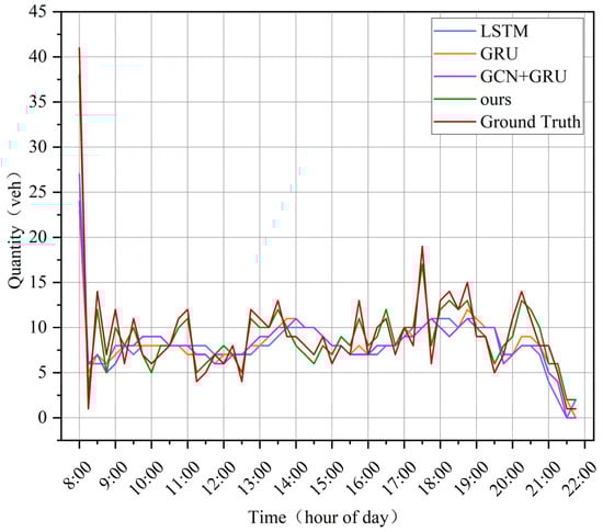 The observation of the comparison of the results reveals that the historical averaging (HA) as well as the moving average autoregressive (ARIMA) models do not perform well on the data set. This is because the nature of both HA and ARIMA models for capturing data are limited to linear relationships, while it is clear that the parking demand exhibits significant nonlinearity in its characteristics. At the same time, the ARIMA model relies heavily on the goodness of the fixed-order results and only fits the series itself without considering the relevant influencing factors of parking demand. The LSTM and GRU, as neural network models with prediction functions, can capture the characteristics of the sequence in the temporal dimension, but not in the spatial dimension, which causes a certain degree of error in their prediction results. Moreover, after adding GCN based on a physical location relationship map, the prediction ability of the model is significantly improved.