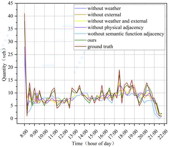 It can be seen that characteristics that have an impact on the overall demand, such as weather and holidays, have an impact on the final prediction accuracy of the demand prediction model proposed in this paper. Second, the impact of internal distribution-related features on the model will be relatively more significant than the impact caused by overall demand-related features on demand forecasts. The results of both the figure and the table indicate that the exclusion of internal distribution-related features affects, to some extent, the model’s ability to capture more intensive changes in demand, especially small fluctuations. For example, in Figure 13, there are small fluctuations in the actual values around 9:00 a.m. It is clear that the model with the semantic functional correlation feature excluded does not capture the small fluctuations in this time period clearly enough, and the predicted results are relatively flat. The model with other features excluded captures such changes, but it is not accurate enough and the error is relatively larger. The model that combines all the features does not capture the relatively abnormal sudden changes like the morning peak accurately enough. This is another aspect that proves that considering the correlation between the parking area itself and the surrounding parking area, including the physical location relationship as well as the semantic functional correlation, has an impact on the demand prediction. The model proposed in this paper incorporates these features to capture these correlations better to some extent and achieves a better representation of the model for these characteristic factors.