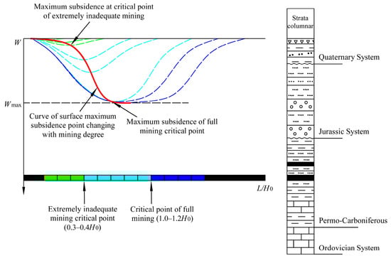 According to the relationship between the mining degree of the working face and surface deformation [22], when the mining degree is small, the surface subsidence increases slowly with the increase in the mining area of the working face. When the mining degree exceeds a certain critical value, the surface deformation will increase sharply (Figure 1). For the purpose of reducing the surface deformation, the mining range of the working face can be controlled within the critical value of the mining degree. According to the characteristics of the surface deformation law under insufficient mining, the large protected area of PLES, and large difference in deformation tolerance, a new integrated technology for regional rock strata and surface subsidence control method was developed, with the combination of source control and ground rehabilitation (Figure 2).