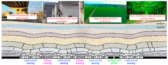 Zonguldak, Turkey, with a population of 300,000, contains multiple coal seams in Kozlu hard coal basin. Underground coal mining has caused damage to surface buildings (structures), road cracks, etc. The buildings above the basin are mainly shanty towns, and local residents have endured damage caused by surface subsidence for many years [10,11,12]. Pennsylvania has more than 50 years of mining history, and about 600 longwall faces have been mined. The mining of 25 faces has resulted in various road damage, including compression uplift, transverse cracks, longitudinal cracks, joint faults, and lane-to-shoulder separation, etc. [13], resulting in significant economic losses. As one of the coal producers and consumers in the world, China is also facing serious conflicts of production-living-ecological space in its coal mining areas. In several large coal bases in the Yellow River Basin of China, the contradiction between the mining-induced aquifer destruction and the ecological protection is prominent in semiarid area of the upper and middle reaches of the Yellow River [14]. In addition, the conflict between mining subsidence and urban development and cultivated land protection in densely populated areas of the Huanghuai Plain is extremely severe. The conflicts between production, living, and ecological space of mining areas also exist in large coal mining countries, such as Russia and India [15,16]. The existing coal mining is simple to cause the problem of production-living-ecological space conflict in mining areas. Therefore, how to realize the coordinated development of underground coal mining in mining areas and the production-living-ecological space on the ground is a bottleneck problem in the world’s major coal countries.