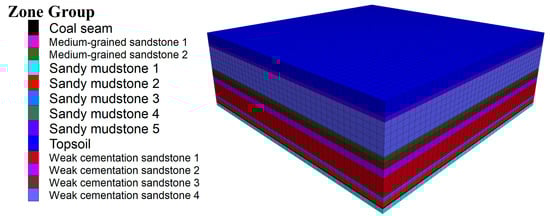 Based on the geological and mining conditions of a mine in Ordos, Inner Mongolia, a numerical calculation model was established by FLAC3D 6.0 software. The size of the numerical model is 2000 m × 2000 m × 663 m. The model is divided into 118,400 units, and each unit is 50 m in length and width. The model height varies with the rock strata. The bottom boundary of the model is fully constrained, the periphery is a horizontal displacement constrained boundary, and the roof is a free boundary. The numerical model is shown in Figure 3. The constitutive model is Mohr-Coulomb model. The distribution of each rock strata and the mechanical parameters of the numerical calculation model are shown in Table 1.