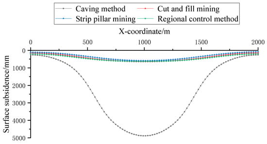 According to the surface subsidence values of main sections of all models, the surface subsidence curves were drawn. In order to compare and analyze the surface subsidence under different mining methods, the surface subsidence curves were drawn, as shown in Figure 4. Compared with the fully caving mining method, the surface subsidence values are smaller by other mining methods. In order to better compare the effect of surface subsidence control, the surface subsidence curves were drawn under backfill mining, strip mining, and RSSC methods, as shown in Figure 5. In order to compare and analyze the influence of the filling face sizes on RSSC method, the surface subsidence values of different filling face sizes were plotted, as shown in Figure 6. Table 5 shows the maximum surface subsidence values.