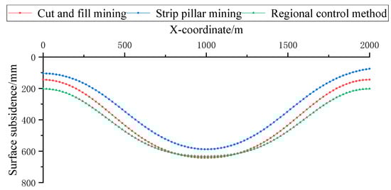 Main section surface subsidence curves under different subsidence control methods.
