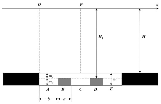 As shown in Figure 8, the black area is the coal mine to be mined, the white area is the goaf, and the gray area is the filling compaction area after coal mining. The actual average mining thickness of the coal seam is m. Assume that the height of the filled body is m2 after compaction, the equivalent mining height is m1, the equivalent mining width is b, and the equivalent retention width is a, then the surface subsidence can be regarded as the joint influence of fully caving mining in the thin coal seam (m1) and the equivalent strip mining in the thick coal mine (m2). The regional surface subsidence values could be calculated by overlaying the pairs.