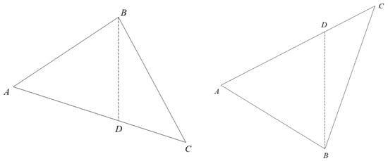 In contrast to rectangles, for each fixed xi, the domain of integration of the triangle in the y-direction was related to xi. When integration was performed along the x-direction, the vertical integration function was different at the inflection point; therefore, the integration calculation needed to be handled separately. In the programming design process, as in Figure 9, ΔABC was divided into ΔABD and ΔDBC to integrate separately. In the special case of a right triangle, the integral value of one of the smaller triangle was zero, and the integral value of the other triangle could be calculated directly. This design method makes the integration result conform to the actual value. At the same time, the whole working face subdivision becomes more refined and the movement and deformation prediction values are closer to the real values.