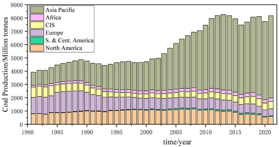 According to BP Statistical Review of World Energy 2022 [1], the global coal production in 1981 was 3916.5142 million tons, and by 2021, the global coal production has reached 8172.6177 million tons, which has increased more than two times (Figure 10). The global coal production shows a trend of growth and stability. In general, the global coal production is maintained above 7400 million tons in order to meet the global coal consumption demand. However, the conventional coal mining will inevitably cause surface subsidence and ecological degradation, resulting in prominent conflict among the production-living-ecological space in mining areas. Although conventional coal mining can guarantee the global coal supply, it brings serious impacts on the residents and ecological environment of mining areas.