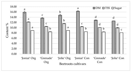 Beetroots’ DM (dry matter) content ranged from 12.60 to 16.30%, their TSS (total soluble solids) ranged from 10.00 to 12.20%, and their sugars ranged from 8.12 to 8.98% (Figure 2). The research data showed that the higher amounts of DM, TSS, and sugars were in organically grown beetroots. Fjelkner-Modig et al. [42] stated that organically grown crops were found to accumulate 2.9% higher DM content than the conventionally grown ones, although for the different crops, contradictory results can be noted. Conventionally grown ‘Joniai’ accumulated about 1-fold more DM, but this difference was insignificant. Regardless of the farming system, ‘Joniai’ beetroots accumulated the highest amounts of DM, TSS, and sugars. Several authors reported a higher content of sugars in organic vegetables, including beetroots, tomatoes, carrots, potatoes, and others, as well as in fruits [43,44].