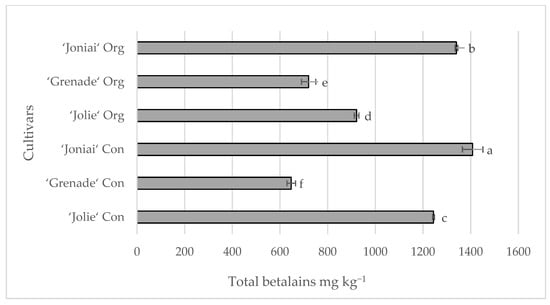 Many studies show that the content of betalains can vary greatly among cultivars as well as growing conditions: 650 and 800 μg g−1 fresh weight [45], 120 mg 100 g−1 dry weight, or 700 and 1300 mg L−1 in beetroots fresh juice [46]. In our study, the total betalains content varied from 647 to 1408 mg kg−1 fw (Figure 3). Significant differences were found between the amounts of betalains in different cultivation systems and in all cultivars of beetroot. Conventionally grown cv ‘Joniai’ and ‘Jolie’ beetroots accumulated 1.0 to 1.4-fold higher amounts of betalains compared with organically grown ones. The cv ‘Grenade’ betalain content was the opposite, depending on the cultivation system; organically grown ‘Grenade’ beetroots accumulated a 1.1-fold higher content of these compounds. The significantly highest content of betalains was found in cv ‘Joniai’ beetroots, regardless of the farming system.