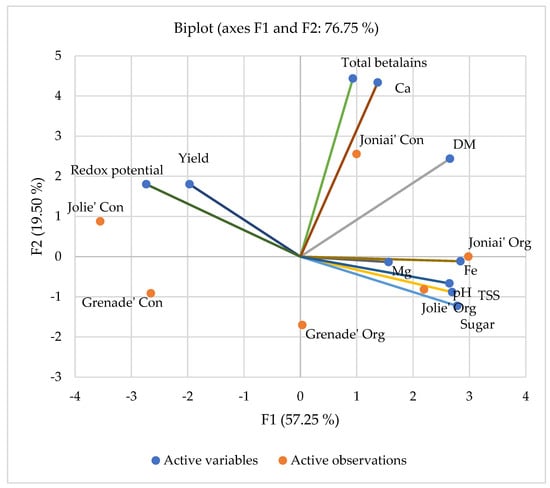 Principal component analysis (PCA) was performed to evaluate the relationships between the different farming systems used and the chemical composition, physical properties, and electrochemical parameters of beetroots (Figure 4).