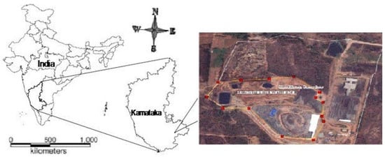 The study area is situated in Bangalore north at latitude 13°50′ North, longitude 77°36′ East in Karnataka. The Mavallipura landfill site has processing units for the waste generated from Bangalore cities. The annual average rainfall is 978 mm. June to September is the primary rainy season and the secondary rainy season is from November to December. The landfill site is located 20 km away from Bangalore city. Since 2005, villagers have been used to the dumping of waste by the local authority in and around the 40.46 ha of land. The landfill site was operated by M/s Ramky Environmental Engineers; it can sustain 600 tons of waste per day. However, BBMP forcefully transmits approximately 1000 tons of waste per day from Bangalore cities. In 2007, villagers complained that the landfill site is unregulated and did not follow the waste-management rules. As per the villagers’ views, the company collects the unsegregated wastes and piles the untreated waste at the landfill site. Hence, the villagers demanded an instantaneous stop to landfill-site activities, as they were illegal and unscientifically managed. Finally, the landfill locations were closed [17]. The Mavallipura landfill site is about 40.48 ha located in Mavallipura village, of which approximately 35 acres is used for the landfill. The geographical representation of the Mavallipura landfill site is shown in Figure 1.