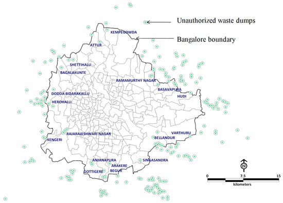 - Chanakya, H.N.; Shwetmala, K.; Ramachandra, T.V. Estimating unauthorized dumping of USW around cities—A case study of Bangalore. In Proceedings of the 2nd International Conference on Sustainable Waste Management, ICON-SWM, Kolkata, India, 9–11 November 2011; pp. 636–642. [Google Scholar]