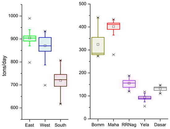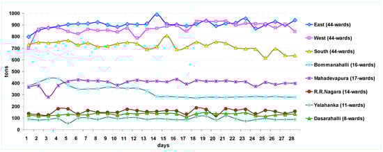 Bangalore generates around 3500 tons of municipal solid waste, with per-capita generation of 0.4 kg/day of domestic waste. We provide an overview of zone-wise data of February 2013 on MSW per day at Bangalore city, as shown in Figure 5. Zone-wise analysis indicates the variability in waste generated in each zone, shown in Figure 6. A quantum of waste generation in three zones (East, West, and South) is high compared to others. In addition, the much lower waste generation in Yelahanka could be attributed to low economic activities.