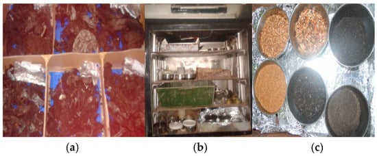 Solid-waste samples were collected at two different locations in the Mavallipura landfill. Samples were collected for every half meter interval (0–0.5 m, 0.5–1 m, and so on) until a depth of 6 m. The solid-waste sample’s first half meter was discarded as it contained the soil cover mixed with the upper layer of waste. Samples were collected in plastic bags, sealed, and labeled, then brought back to the laboratory, and all the samples’ moisture content was determined. The rest of the samples were spread out for air drying in the room, as shown in Figure 7. They were further dried at 65 °C in an oven, and then the various components were manually separated and weighed. The soil component was separated using sieves of different sizes into three fractions, namely, <2.36 mm but >1.18 mm, <1.18 mm but >600 µm, and <600 µm. The smallest bit (<600 µm) was used to determine the TOC analyzer’s carbon content.