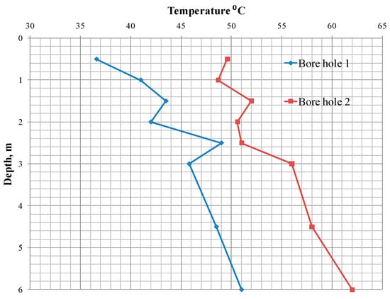 The temperature of the MSW material was recorded as soon as the waste was brought to the surface and an attempt made to evaluate the age of the MSW material; newspaper, magazines, or other documents can provide general information on the age of the MSW in the landfill at the location of the bore. As Figure 8 shows, the temperature tended to increase with depth, due to the heterogeneity of the material. The highest temperatures for landfills were generally reported at mid-waste elevations with temperatures decreasing near the top. The temperatures near the top underwent variations like seasonal temperature fluctuations, whereas the temperatures at greater depths generally follow stable trends. The initial decomposition of wastes in a landfill occurs under aerobic conditions. Anaerobic conditions prevail upon the depletion of oxygen at the bottom of the landfill. However, the trend shows some variations due to the heterogeneity of the waste.