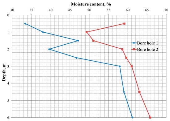 At each depth, the moisture content of the MSW material was estimated using dry gravimetric moisture content: the ratio of the mass of water in a waste sample to the mass of solids in the waste sample, expressed as a percentage. During the moisture-content determinations, the temperature was maintained at 60 °C to avoid combustion of volatile materials. As Figure 9 shows, the moisture content tended to increase with depth. The moisture content increased with depth due to degradation. The increase in moisture content may also contribute to the increase in moisture-content-withholding capacity of MSW due to the disintegration of particles after degradation.