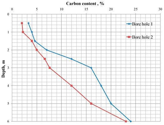 The typical height of solid-waste dumping is 6 m above ground level and the deposit consisted of uncompacted waste. By using a total organic carbon (TOC) analyzer, total organic carbon expressed as a percentage was evaluated with respect to depth. As Figure 12 shows, the carbon stored in organic matter increases with depth from approximately 2% at 1.0 m depth to 23% at 6 m depth. Similarly, the total carbon content of MSW in other countries has been reported to be in the same range, with 15.74 to 29.67% being identified for Taiwan [21]. These ranges are more representative of a heterogeneous material obtained from MSW in-situ testing.