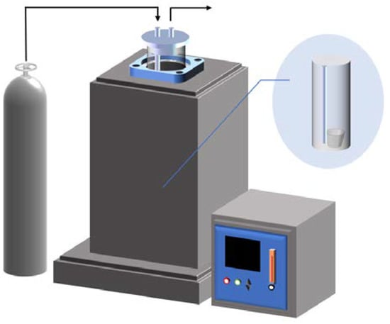 As shown in Figure 1, a high-temperature vertical furnace reactor was used to prepare the TRP under a nitrogen atmosphere at the designed temperature. The heating rate of the resistance furnace can be controlled. In the experiment, a corundum crucible containing tar residue was positioned at the base of a quartz tube, which measured 80 mm in bottom diameter and 750 mm in height. A flanged valve with inlet and outlet ports was utilized to seal the end of the quartz tube. Prior to initiating the temperature protocol, N2 gas was purged for 20 min to clean the quartz tube. A heating rate of 7 °C/min was applied for the pyrolysis of the tar residue in N2, with a flow rate of 50 mL/min. After reaching the final designed temperature (500, 600, 700, 800, or 900 °C), the pyrolysis temperature was continued for 30 min and then cooled to room temperature under an N2 atmosphere. Finally, part of the TRP was crushed into 50-mesh powder.