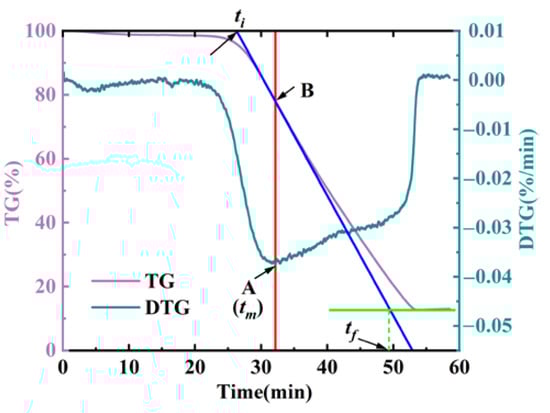 Point A is selected to represent the point of the minimum value of the DTG curve, whose abscissa value is considered the middle gasification time (tm). B is the intersection of the vertical line through point A and the TG curve. The tangent line is drawn at point B. The horizontal coordinate of the tangent line’s intersection with y = 1 is the initial gasification time (ti), and the horizontal coordinate of the tangent line’s intersection with the horizontal line through the end of the TG curve is the final gasification time (tf) [,]. The temperatures corresponding to the initial gasification time and the final gasification time are the initial gasification temperature (Ti) and the final gasification temperature (Tf).