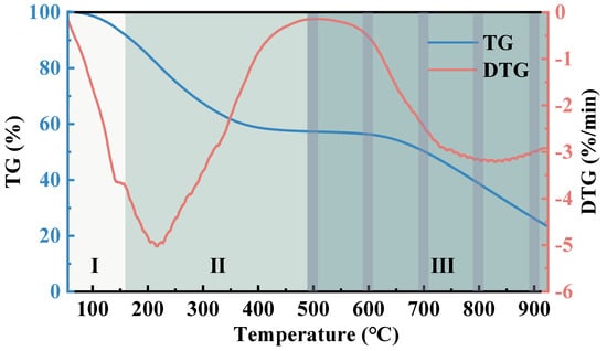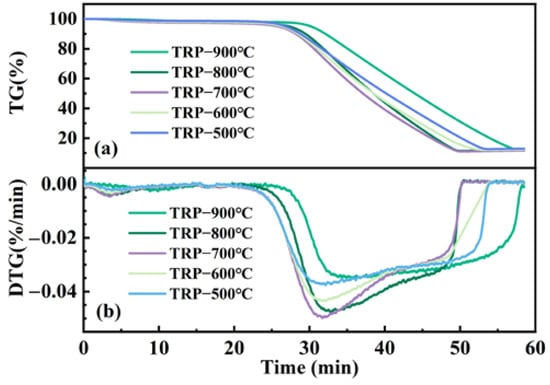 The properties of TRP were impacted by the pyrolysis temperature. Prior to characterizing the surface features, a brief analysis of the tar residue pyrolysis mechanism was conducted. As depicted in Figure 3, the pyrolysis process of tar residue can be divided into three key stages. The initial stage encompasses a temperature range of room temperature to 160 °C and involves moisture evaporation and desorption gases. The second stage occurs at temperatures ranging from 160 to 500 °C and consists of depolymerization and decomposition reactions. The TG curve rapidly decreases, with a mass loss of approximately 35%. The third stage, which occurs at temperatures above 500 °C, is primarily a condensation reaction, with a mass loss of approximately 33%. According to the pyrolysis process, the TRP prepared at 500, 600, 700, 800, and 900 °C, covering the third stage, was selected for characterization.