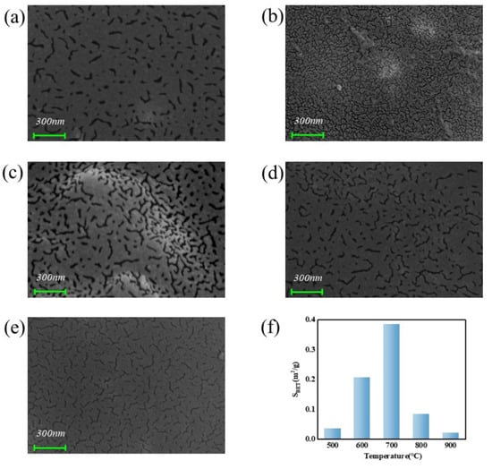 Evolution of the micromorphology of TRP prepared at different pyrolysis temperatures: (a) SEM-500 °C; (b) SEM-600 °C; (c) SEM-700 °C; (d) SEM-800 °C; (e) SEM-900 °C; (f) BET specific surface area.