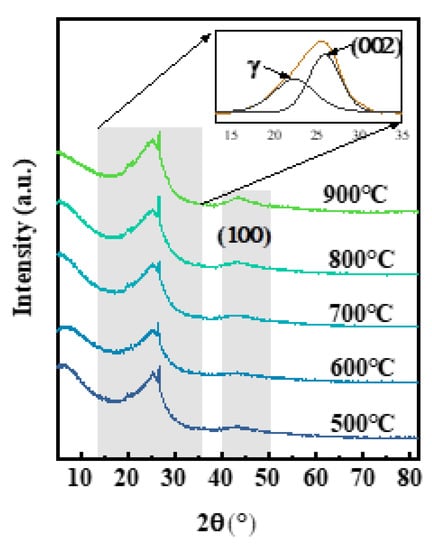 Many studies [,] have shown that the peaks present from 15° to 30° are constituted by the combined superposition of the 002-peak and the γ-peak, which is to the left of the 002-peak. The 002-peak is the stacking between the structures of the aromatic layer. The γ-peak is related to the structure of the side chains of aliphatic hydrocarbons, various functional groups, and alicyclic hydrocarbons connected to the structure of the aromatic rings, and the 100-peak represents the size of the aromatic layer.
