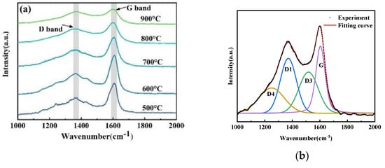 TRP spectra prepared at different pyrolysis temperatures typically exhibit two overlapping peaks, namely, peak D at 1100–1500 cm−1 and peak G at 1500–1700 cm−1 []. However, the original Raman spectra are the result of the superposition of several peaks, which need to be further split and adjusted into five peaks—D1, D2, D3, D4, and G. Peak D1 in the 1350 cm−1 band commonly refers to vibrations related to disordered graphite lattices with imperfections in the plane, such as defects and heteroatoms. The presence of D3 and D4 indicates that there are a large number of amorphous forms of carbon in the TRP, reflecting active sites. Peak G is related to an ideal graphite lattice vibrational mode with E2 g symmetry [,,]. During the fitting process, it was found that the fitting of peak D2 was relatively low and the position was far away, so four peaks were used to fit the Raman spectra of the pyrolysis product (D1, D3, D4, and G) [].