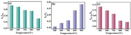 TRP intensity ratios prepared at different temperatures: (a) IG/IAll; (b) ID1/IG; (c) ID3 + D4/ID.