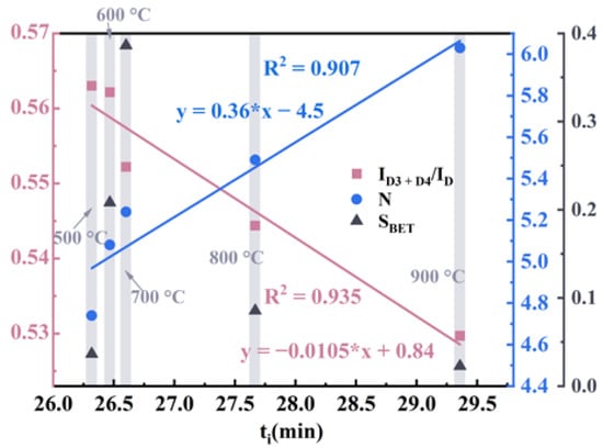 Figure 9 shows the relationships between the initial gasification time and the structure parameters. As can be seen in Figure 9, ti is inversely proportional to ID3 + D4/ID and positively proportional to N, while there is no significant functional relationship with SBET. The carbon structure (ID3 + D4/ID and N) was more important for ti than the surface structure (SBET), particularly for ID3 + D4/ID, which may reflect the amorphous carbon trend in TRP.