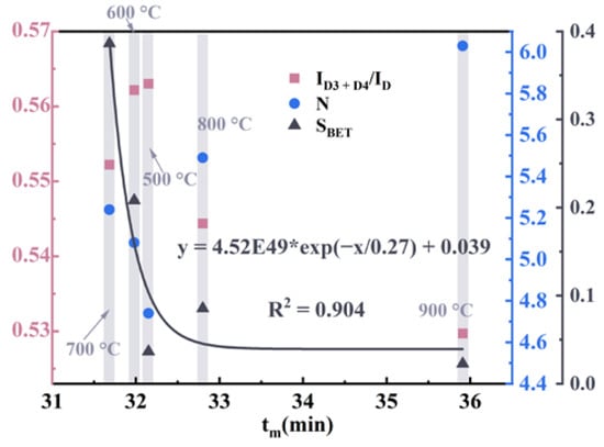 As can be seen in Figure 10, a wonderful exponent correlation between SBET and tm of , with R2 = 0.904 was observed, while the correlation between ID3 + D4/ID and N with tm was relatively low. The correlation between the surface structure and tm was greater than that of the carbon structure. A larger SBET corresponds to an earlier middle gasification time. This is explained by the fact that larger SBET and pores possibly resulted in the easier entry of the gasification agent into the macromolecular structure of TRP and an increased effective contact area between the TRP and the gasification agent, leading to an increase in the chance of chemical reactions.