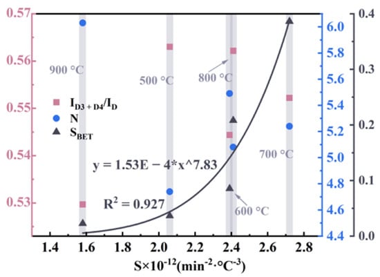 Figure 11 shows the relationships between S and the structure parameters. There was a clear functional relationship between SBET and S of , with R2 = 0.927, while ID3 + D4/ID and N did not have an obvious functional relationship with S. For S, the surface structure played a more important role than the carbon structure. As a result of the fine correlation between S and SBET, the SBET could act as a rough indicator for evaluating the gasification reactivity of TRP.