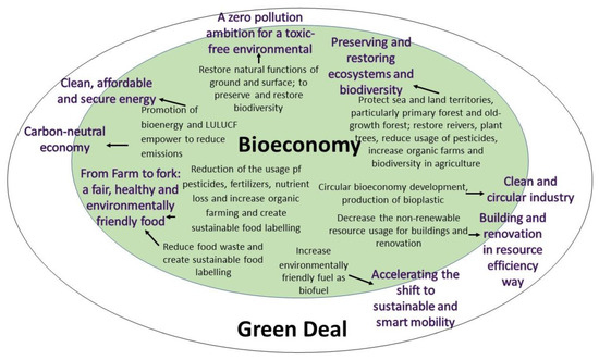 Referring to the definition of the bioeconomy that it is related to the biological resources [7,8], which is mainly associated with the agricultural sector, the bioeconomy comprises a small part of the EU Green Deal. Meanwhile, the European Green Deal includes more sectors such as transport, construction, industry, etc. Therefore, the following chapters are dedicated to highlighting the importance of the bioeconomy in all categories of the EU Green Deal goals.