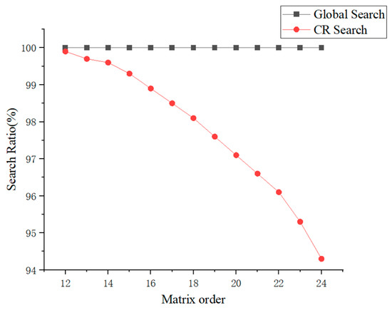 In Figure 3, the performance of the GS strategy is essentially equivalent to that of the CR control strategy when the order of the conflict matrix is less than 20. However, when the order of the conflict matrix exceeds 20, the CR control strategy outperforms the GS strategy. When the order of the conflict matrix reaches the experimental upper limit of 24, the CR control strategy requires only 0.00869 s of search time, which satisfies the real-time requirements of the control system. As shown in Figure 4, as the order of the conflict matrix increases, the search efficiency of the CR control strategy exhibits a downward trend, but the search rate still remains above 94.5%, which generally meets the performance requirements of the control system.