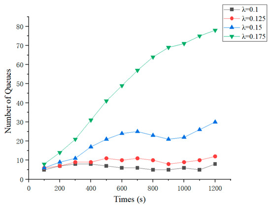 The arrival of vehicles at each entry direction of the intersection follows a Poisson distribution with a mathematical expectation of λ, where λ takes values of 0.1, 0.125, 0.15, and 0.175. The queueing situation of vehicles at the intersection was recorded for 2 min. As shown in Figure 5, the total number of vehicles queued under the CR control strategy is below 26 when λ takes values of 0.1, 0.125, and 0.15. When λ = 0.175, the number of queued vehicles shows an increasing trend, but it still remains below 80, demonstrating the strong robustness of the strategy.