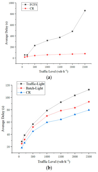Average delays of the vehicles in balanced traffic. (a) Comparison of Performance between CR and FCFS Scheduling Strategies, (b) Comparison of Performance between CR Strategy, Traffic-Light Strategy, and Batch-Light Strategy.