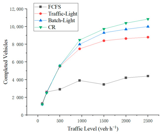 As shown in Figure 7, as the traffic flow density increases, the number of deadlocks in the FCFS control strategy also increases, and the number of completed vehicles increases relatively slowly. When the traffic flow density is less than 500 veh·h−1, the performance of the CR control strategy is basically comparable to that of other strategies. When the vehicle density exceeds 1000 veh·h−1, the CR control strategy is superior to the other strategies.