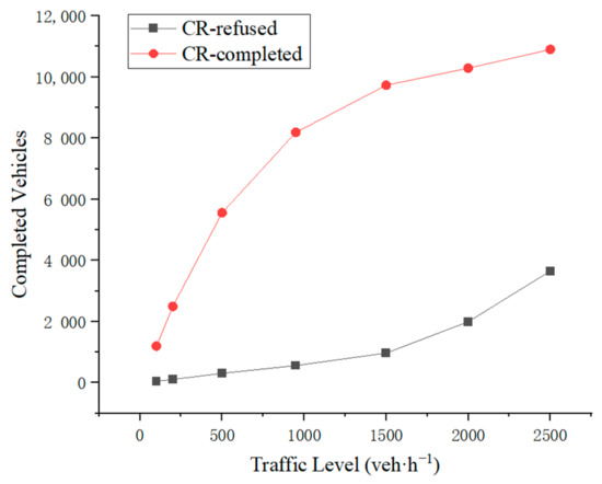As shown in Figure 8, in terms of the number of vehicles served and rejected by the CR control strategy, as the traffic flow density increases, the number of vehicles served (i.e., completed) shows an increasing trend, but the rate of increase slows down when the vehicle density exceeds 1000 veh·h−1. The number of rejected vehicles also increases with the vehicle density, and when the vehicle density is 2500 veh·h−1, the number of rejected vehicles is 3656, thus showing a gradually increasing trend. This is because as the traffic flow density increases, the number of requests in each cycle increases, leading to a gradual decrease in the efficiency of finding the optimal solution, i.e., the maximum clique, in each cycle.