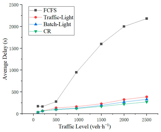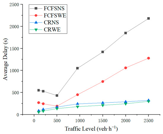 As shown in Figure 6, when the traffic flow density is less than 240 veh·h−1, the average waiting time of the CR control strategy and other strategies remains within an acceptable range. When the traffic flow density exceeds 300 veh·h−1, the average waiting time of the FCFS control strategy increases substantially. When the vehicle density exceeds 2000 veh·h−1, the average waiting time of the CR control strategy is lower than that of the other control strategies.