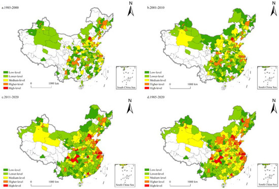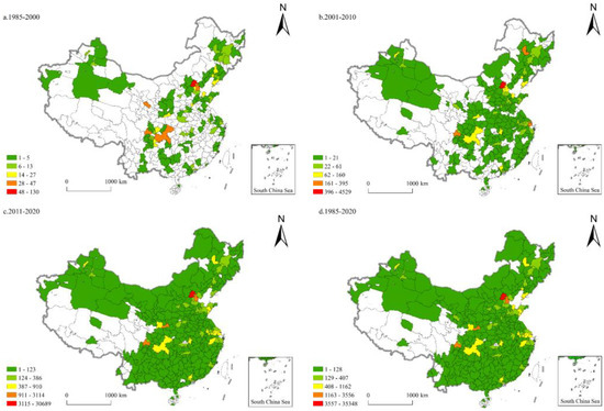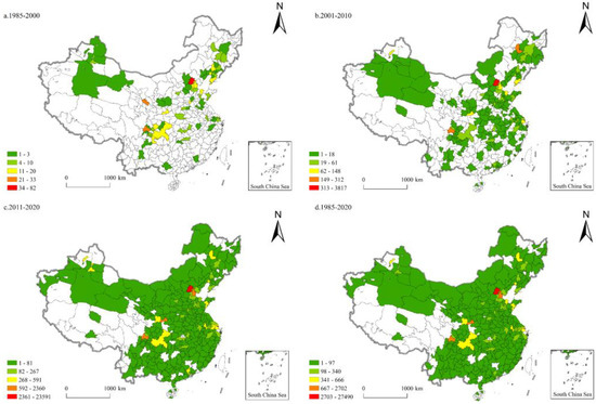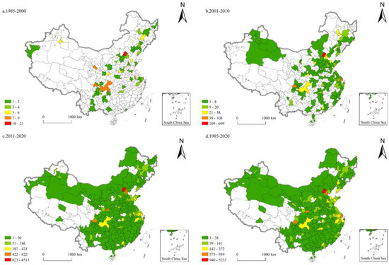The utilization of natural gas was the terminal link of the natural gas industry [102]. It formed a collaborative innovation trend with many related industries, such as the thermoelectric industry, the food processing industry, and the metalworking industry. Due to the late start of China’s natural gas industry, the technological innovation in natural gas utilization lagged behind that seen in natural gas equipment and engineering and natural gas production and processing. Its innovation pattern was represented by the “double-headed” model of Beijing and Chengdu, with Tianjin, Xi’an, Shanghai, and other regions playing a supporting role. In total, 61 cities participated in the technological innovation of natural gas utilization from 1985 to 2000 (Figure 7). Beijing and Chengdu boasted the richest innovation achievements, and the other innovation achievements were mostly concentrated in Lanzhou, Dongying, Urumqi, Changchun, and other regions rich in oil and gas resources. From 2001 to 2010, the number of participating cities reached 157, and the scale of innovation achievements in Shanghai, Daqing, Xi’an, and other cities expanded significantly. The number of participating cities further increased to 289 from 2011 to 2020. Tianjin showed strong growth momentum and formed a two-city interactive innovation agglomeration with Beijing. The agglomeration levels of Suzhou, Hangzhou, and Shanghai in the Yangtze River Delta continued to improve. Wuhan, Qingdao, and other cities with developed industries and large energy consumption demands contributed to the growing number of innovation achievements.