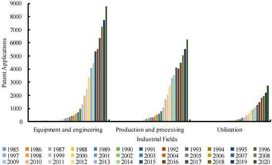 As shown in Figure 2, patent applications focused on technological innovation in the natural gas industry made outstanding progress in terms of the spatial distribution of subjects, the expansion of the application scale, and the expansion of technical fields between 1985 and 2020. The number of cities involved in patent applications increased from 9 in 1985 to 309 in 2020, while the total number of patent applications increased to 67,949 during the same period. The analysis of technical fields based on the IPC subclass classification showed that the technological frontier of technological innovation in China’s natural gas industry continues to expand, with the number of technical fields increasing from 9 in 1985 to 396 in 2020.