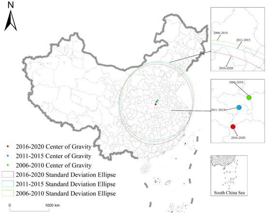 The center of gravity and standard deviational ellipse (CGSDE) is an analytical method used to characterize the spatial distribution characteristics of geographical elements, including the average center coordinates, azimuth, and the standard distances of the major axis and minor axis [91]. Here, CGSDE is used to interpret the spatial pattern evolution characteristics of China’s natural gas industry’s technological innovation capability. The calculation formula is as follows: