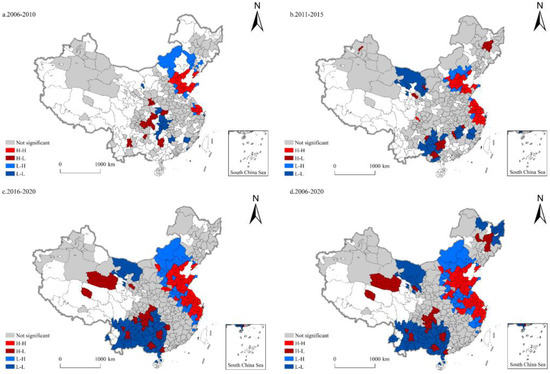 Local spatial autocorrelation analysis aims to accurately grasp the relevance of local spatial elements [95]. A LISA aggregation diagram is drawn by measuring the Local Moran’s I, and the type characteristics of the high and low agglomeration area (H-H), the low and low agglomeration area (H-L), the low and high agglomeration area (L-H), and the low and low agglomeration area (L-L) can be determined [96]. The calculation formula is as follows: