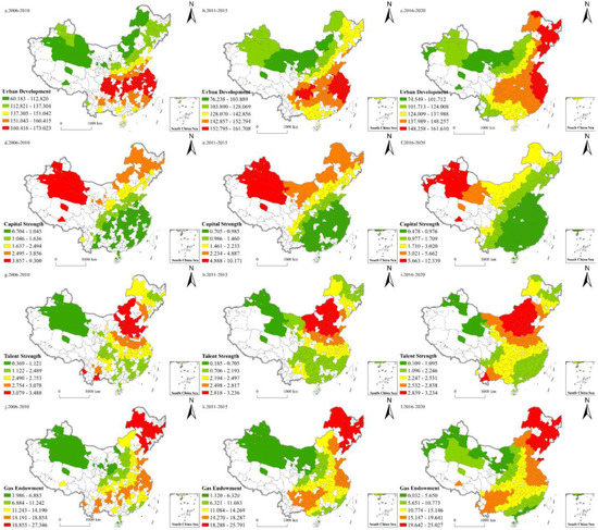 The scale of technological innovation in natural gas utilization in the thermoelectric industry and in the metalworking industry was relatively large (Table 4), with 255 and 229 participating cities and 357 and 259 technical fields, respectively. The core areas were concentrated in Beijing, Chengdu, Xi’an, Shanghai, Tianjin, and other large cities with large populations and strong economies; this shows the relative maturity of the technological innovation of natural gas utilization in the thermoelectric industry and in the metalworking industry. Beijing was the core in almost all related industries. Tianjin, Chengdu, and Karamay made notable achievements in natural gas utilization in the food industry, while the Yangtze River Delta cities boasted the most achievements in natural gas utilization in the rubber industry. Environmental protection innovation in natural gas utilization was widely distributed among 136 cities, with Beijing as the core and Xi’an, Shanghai, Chongqing, Tianjin, and Chengdu as the supporting force. The technological innovation of natural gas utilization in the automotive industry was distributed across 137 cities, including Beijing, Shanghai, Changchun, and other cities with prominent advantages in automobile manufacturing. Low-level technological innovations of natural gas utilization were seen in the textile and clothing industry, the agriculture and forestry industry, the pharmaceutical industry, and the paper and printing industry, but the technical fields in each related industry showed an expansion trend.
