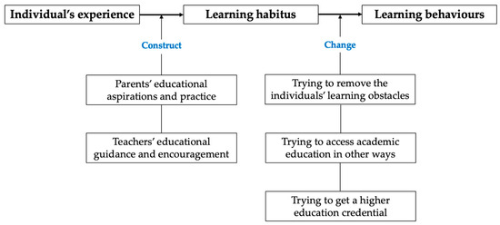 Participants’ life and learning experiences in this study fell into these main groups: parents’ related experiences that guide individuals’ original taste for academic education; teachers’ related experiences that strengthen students’ aspiration about academic outcomes; personal experiences about academic learning obstacles; and social interaction experiences, such as part-time summer job experience. The research findings are presented in Figure 1. Various experiences indicated that students’ learning habitus was developed at an early age in their life, and their positive learning behaviour in academic education mainly came from their parents’ guidance and teachers’ encouragement. However, “habitus is durable but not eternal” [40]. With the accumulation of numerous personal experiences, students began to have their own feeling and understanding about academic education gradually. Most had learning difficulties, which decreased their positive learning behaviour in academic education. Students still have a common recognition: a higher education credential is pivotal to them for future job seeking. All participants, therefore, constructed their learning habitus and drove their learning behaviour with reference to their experiences related to social interactions.
